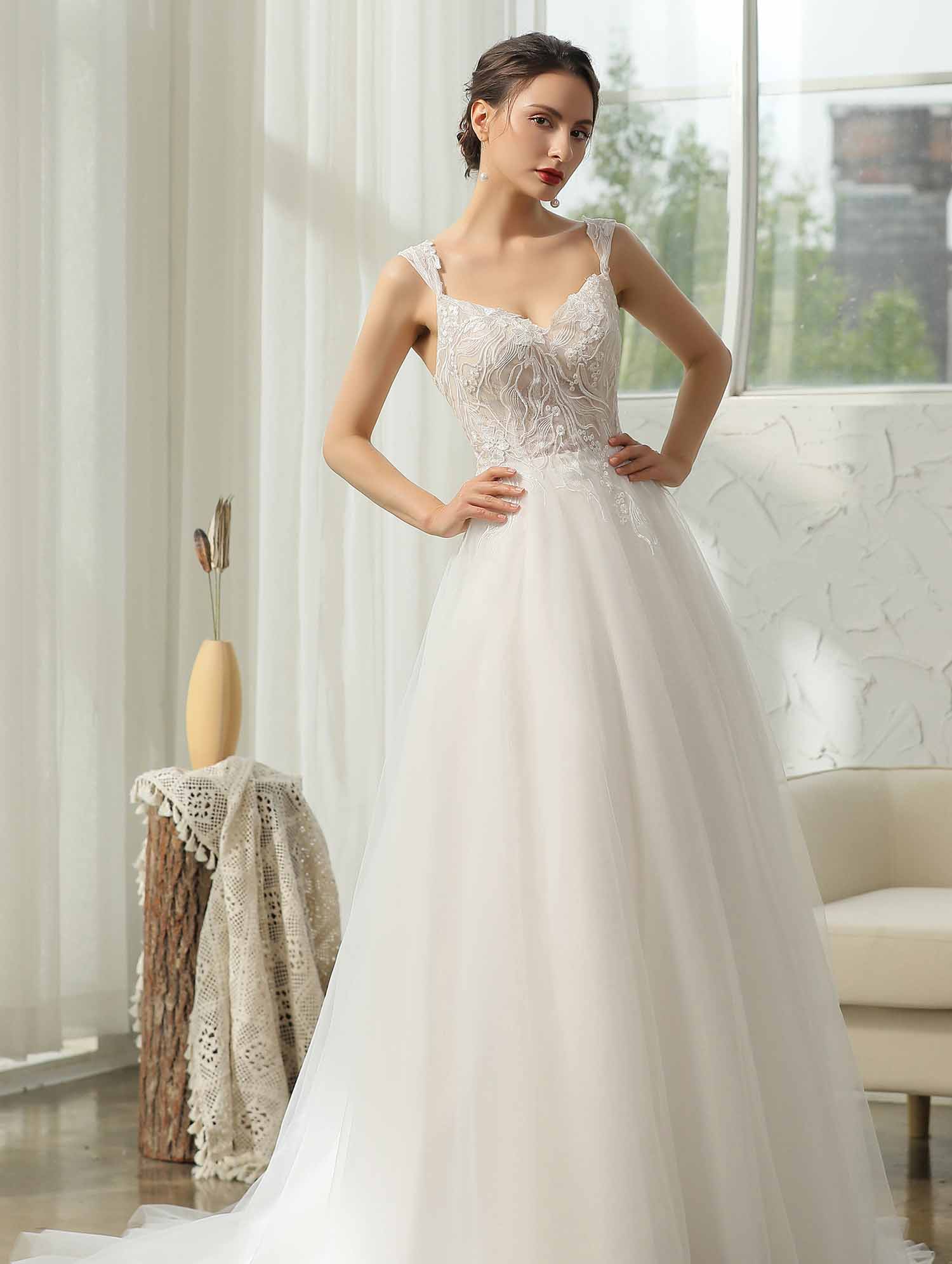 The stunning simplicity of this princess-style dress shines in soft embroidered tulle with a fitted lace semi sheer bodice endowed with V neckline and subtle sequinning. Showed in ivory.