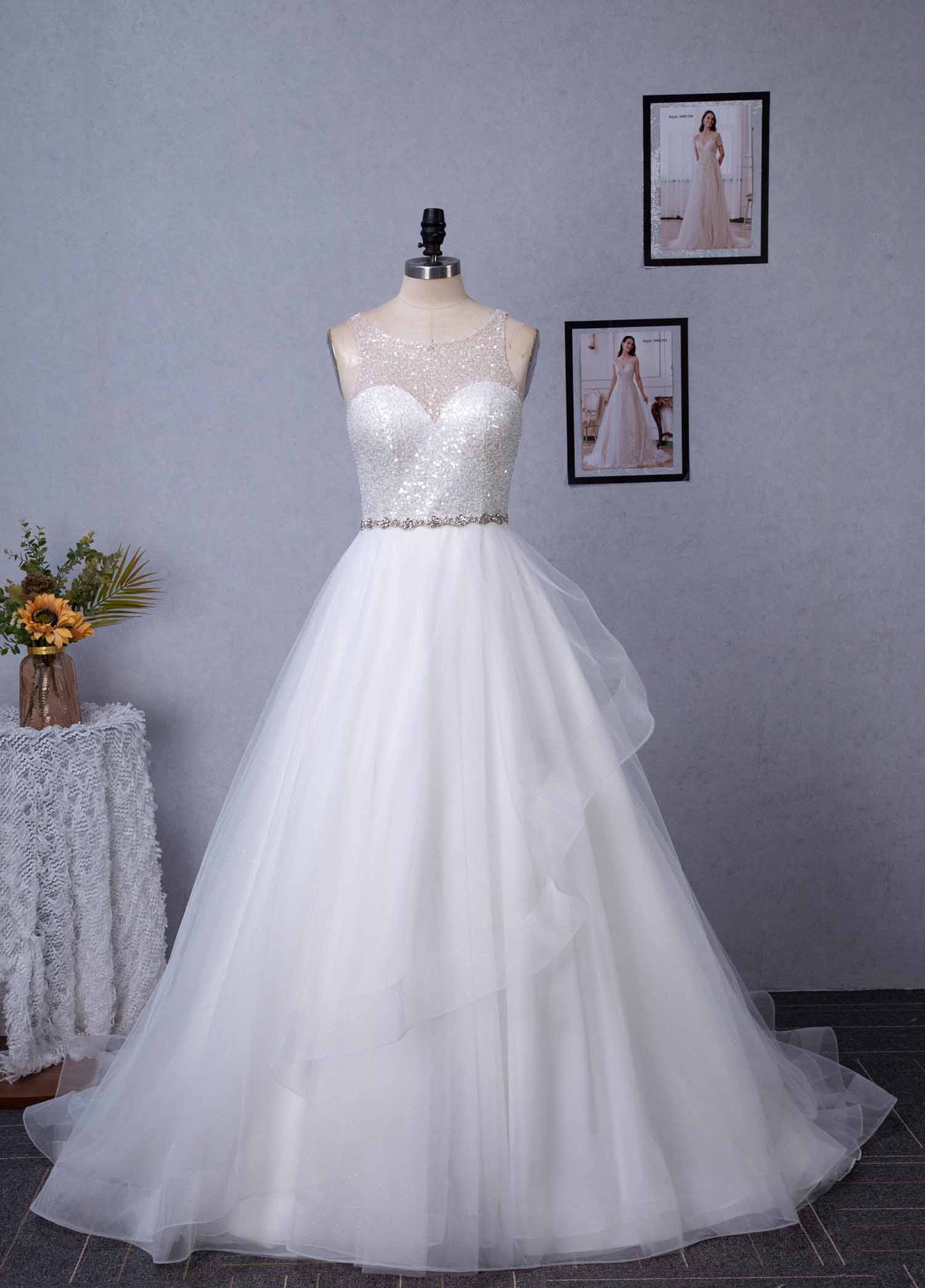 This wedding dress has an illusion allover beaded bodice that leads into a natural waistline with a crystal belt. Features a high neckline, ruffled glitter tulle skirt with horsehair trim, and a keyhole open back. You feel like a princess on your big day wearing this shining beaded ball gown.