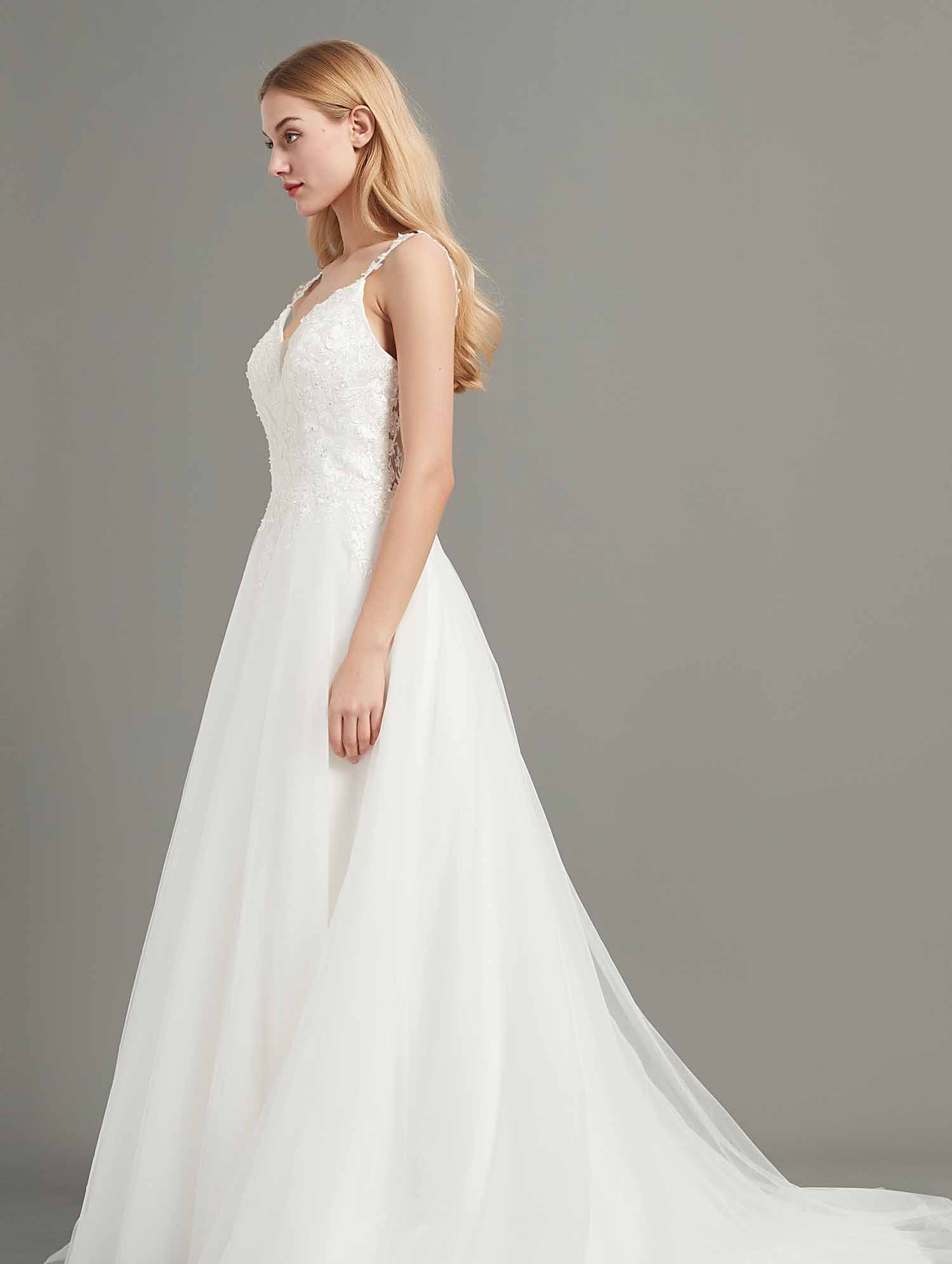 The light and ethereal wedding dress features appliquéd straps and V-neck Lace bodice accented in crystal beading.A flowing A-Line tulle skirt and a plunging V-back complete the look.Shown in Ivory.